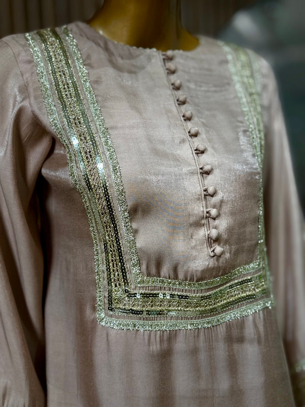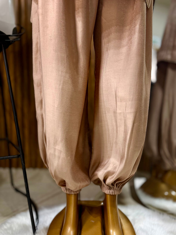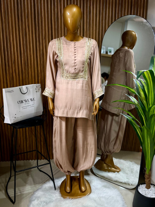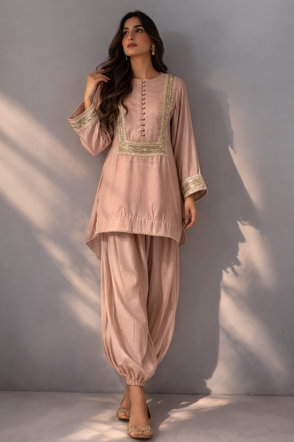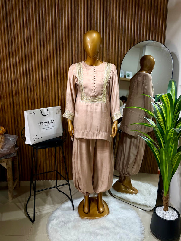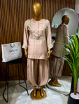 It features a cotton silk loose fit shirt paired with cotton silk balloon pants, designed to be lightweight and perfect for summer & Eid. Limited edition